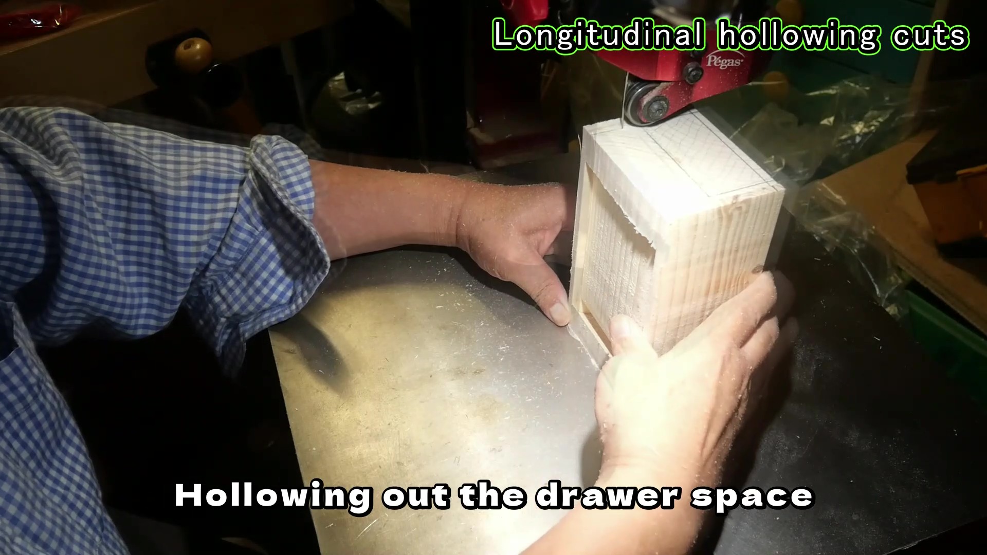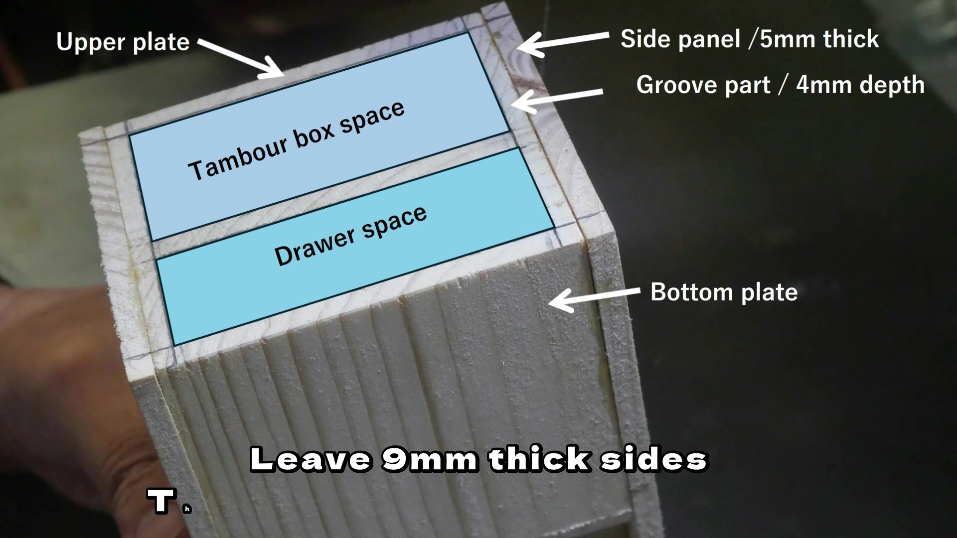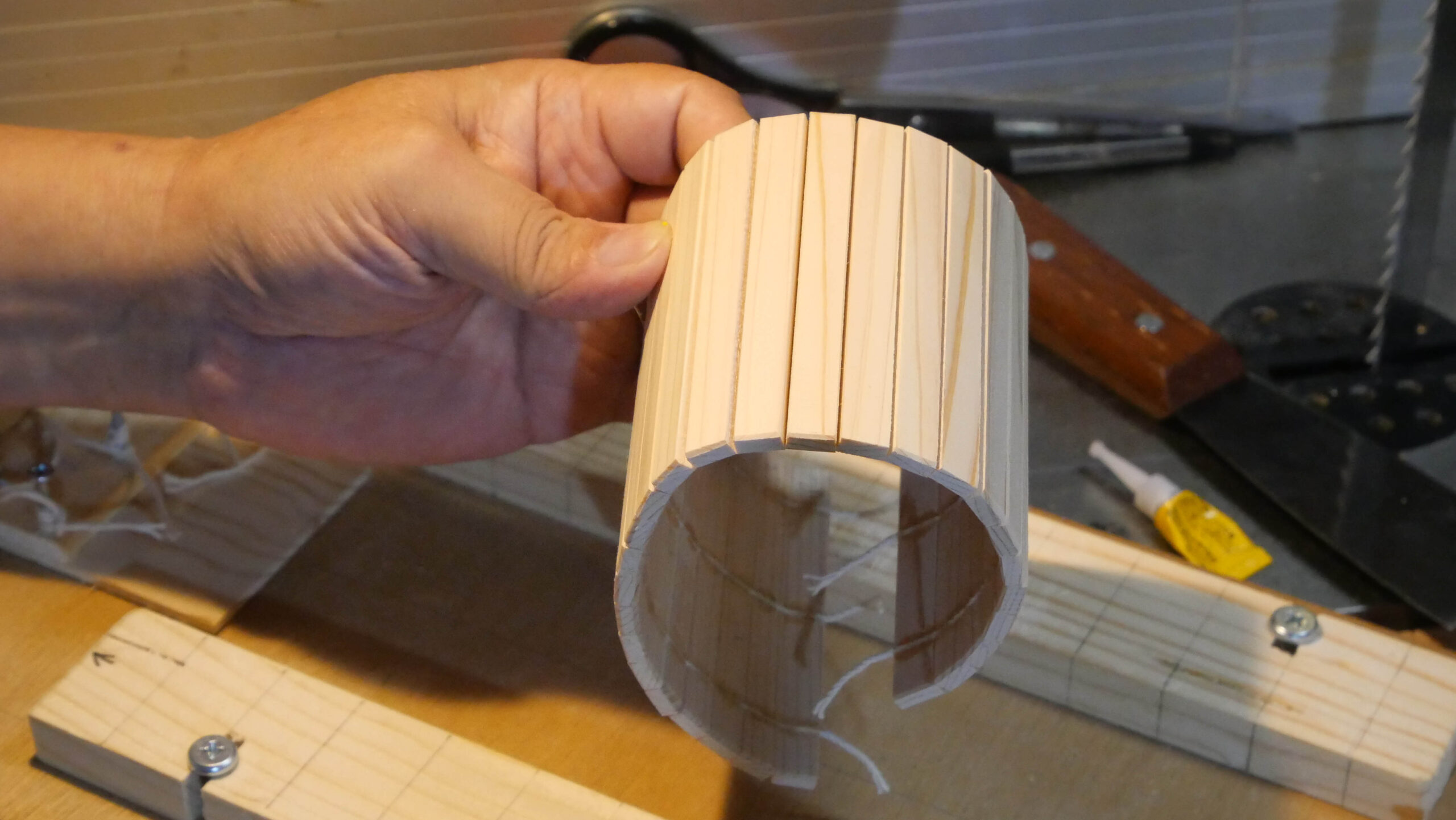 そこで、通常は、タンボールBOXは、テーブルソーとルーターを使って作られます。どちらも正確な加工が得意ですが、この二つの機械は、高齢のDIYerにとって安全なツールとは言えないし、なにしろその爆音は夜中の楽しい木工作を許してくれません。一方、バンドソーは比較的安全なツールであり、加えて、その軽やかな音は心地良くさえ聞こえます(私の主観です)。私は25年前にテーブルソーとルーターを片付けてしまい、バンドソーを中心に木工作を楽しんでいます。もちろん、真夜中の作業は至福の一時です。