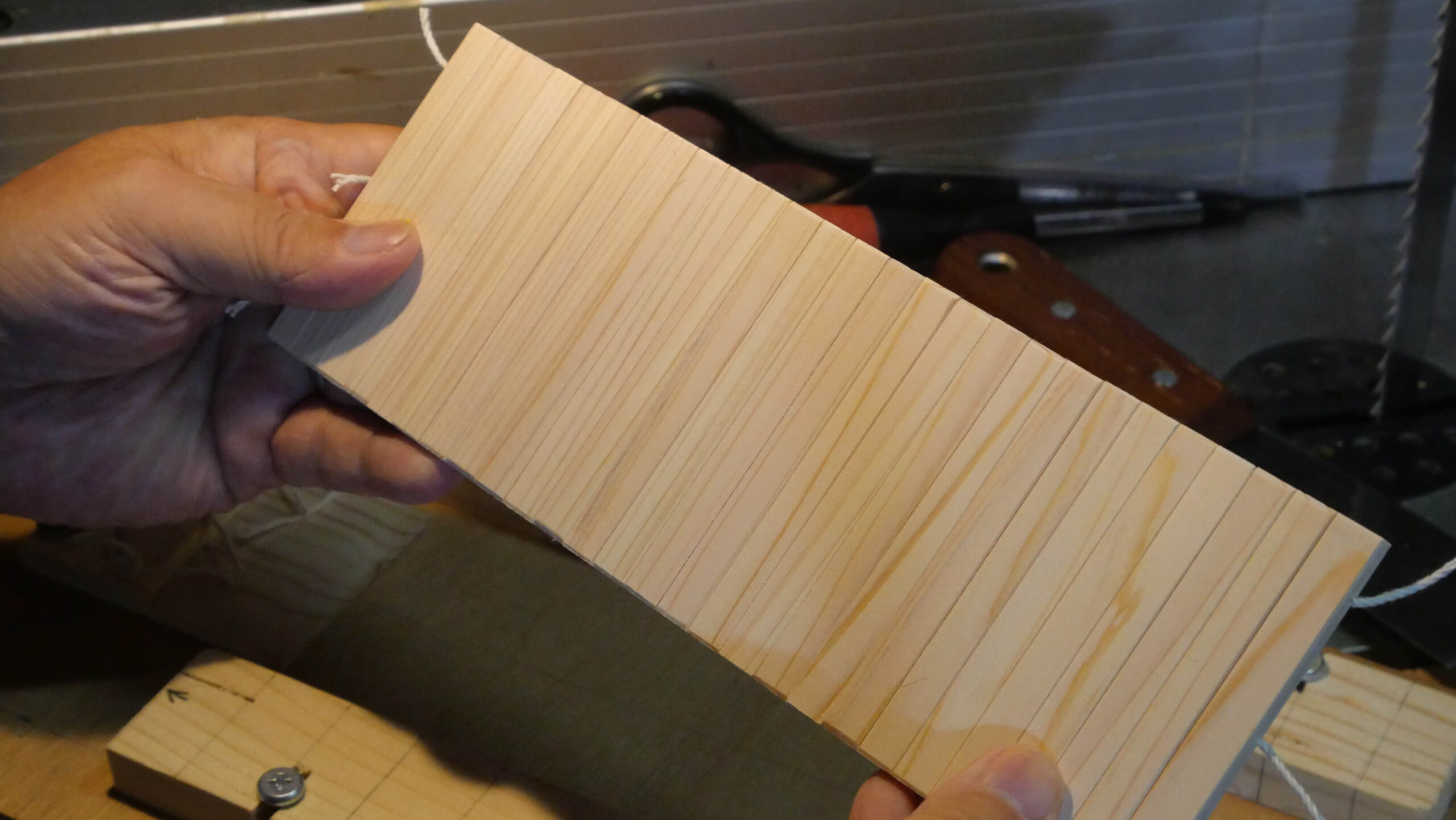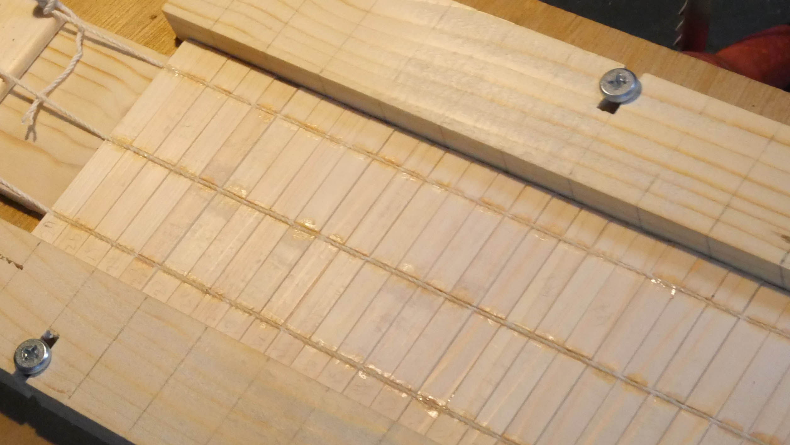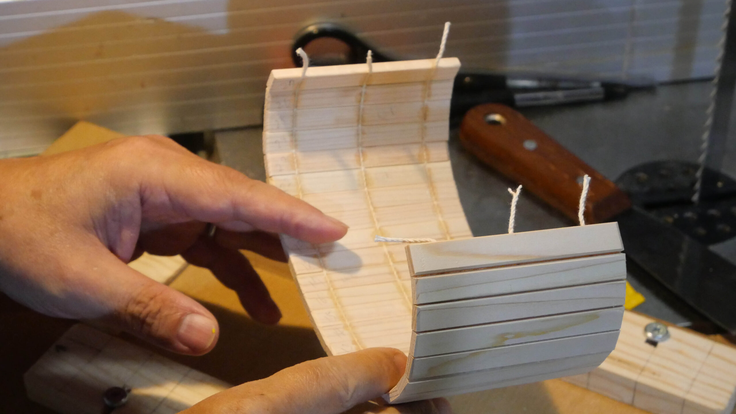 もう一つの特徴は、蛇腹の扉の作り方です。通常は木片を並べた裏に布を張って帯状に仕上げますが、布の代わりにタコ糸(麻糸)を使いました。