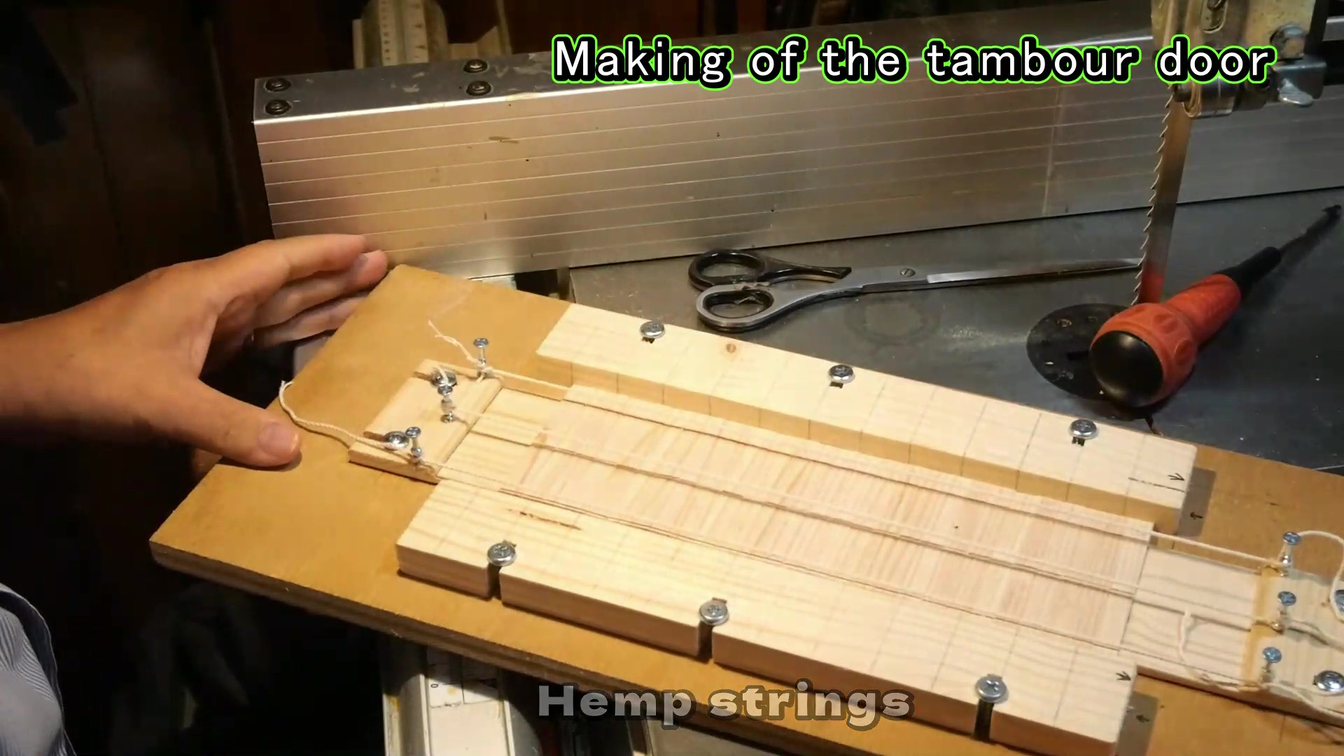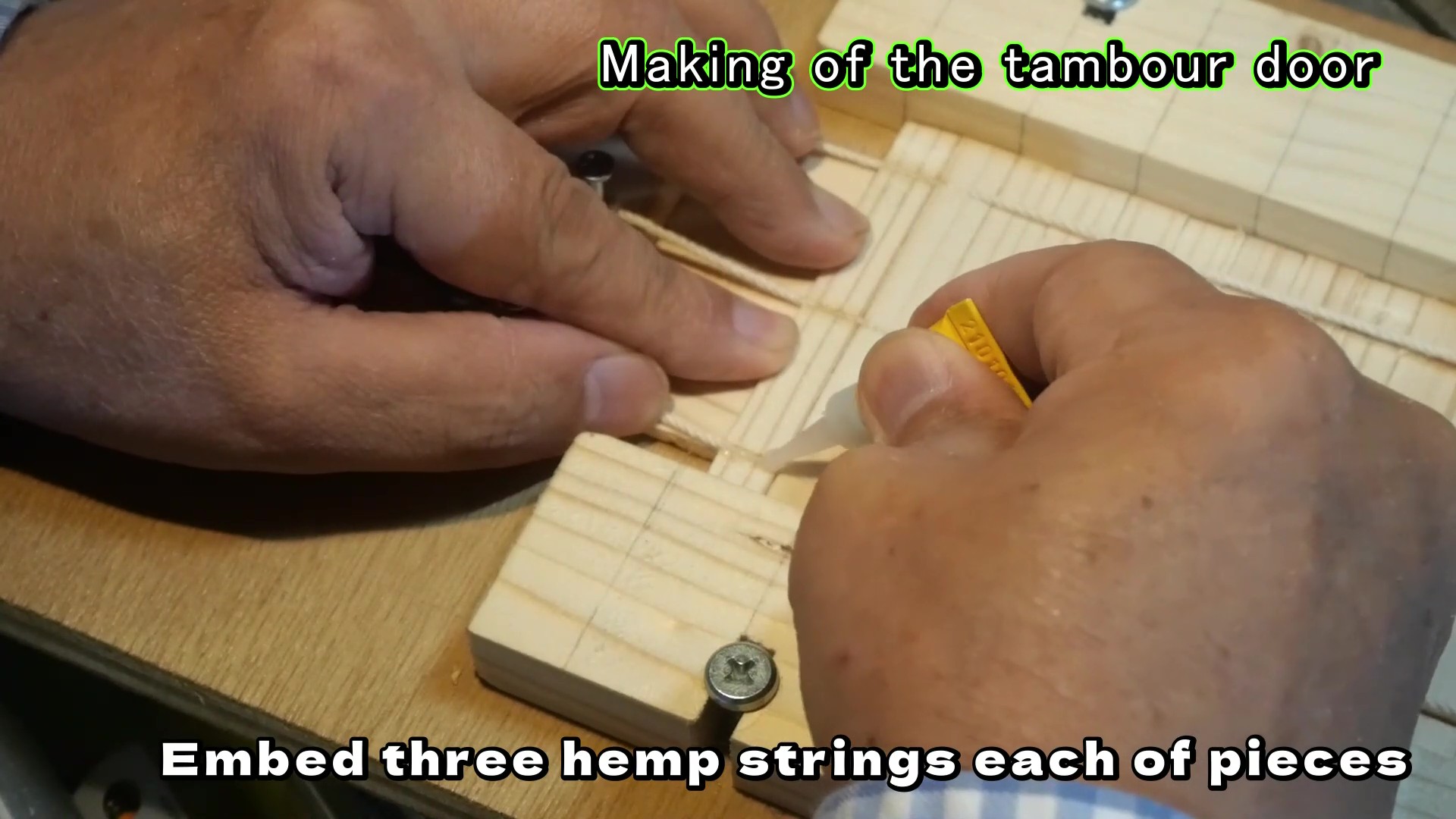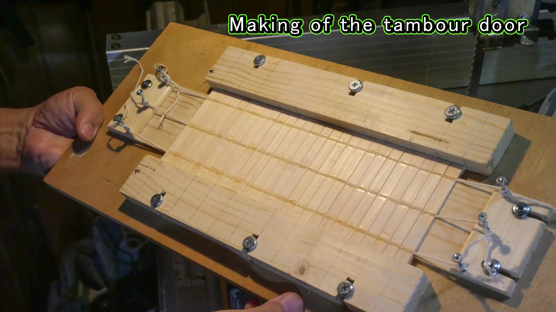 もう一つの特徴は、蛇腹の扉の作り方です。通常は木片を並べた裏に布を張って帯状に仕上げますが、布の代わりにタコ糸(麻糸)を使いました。