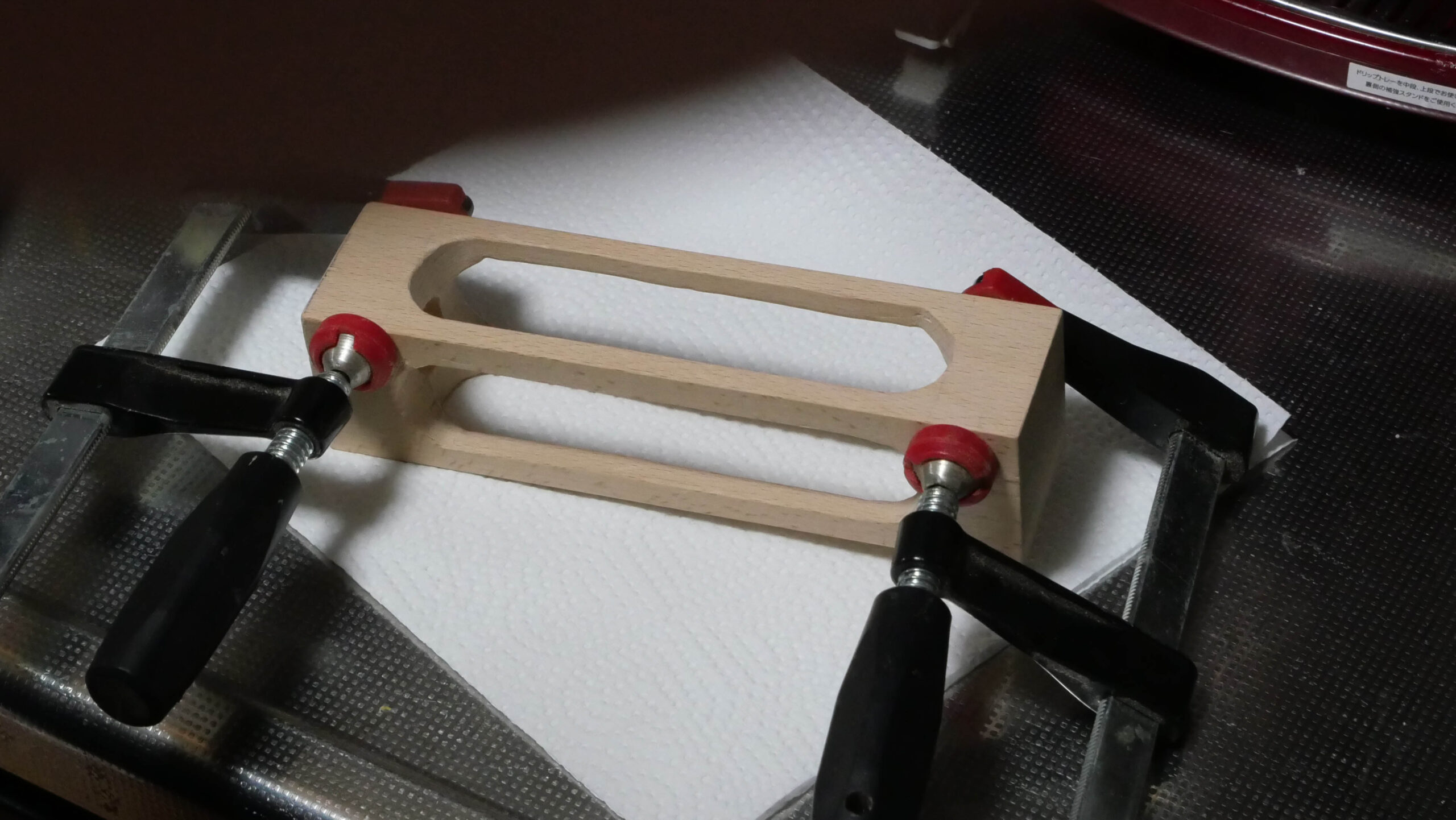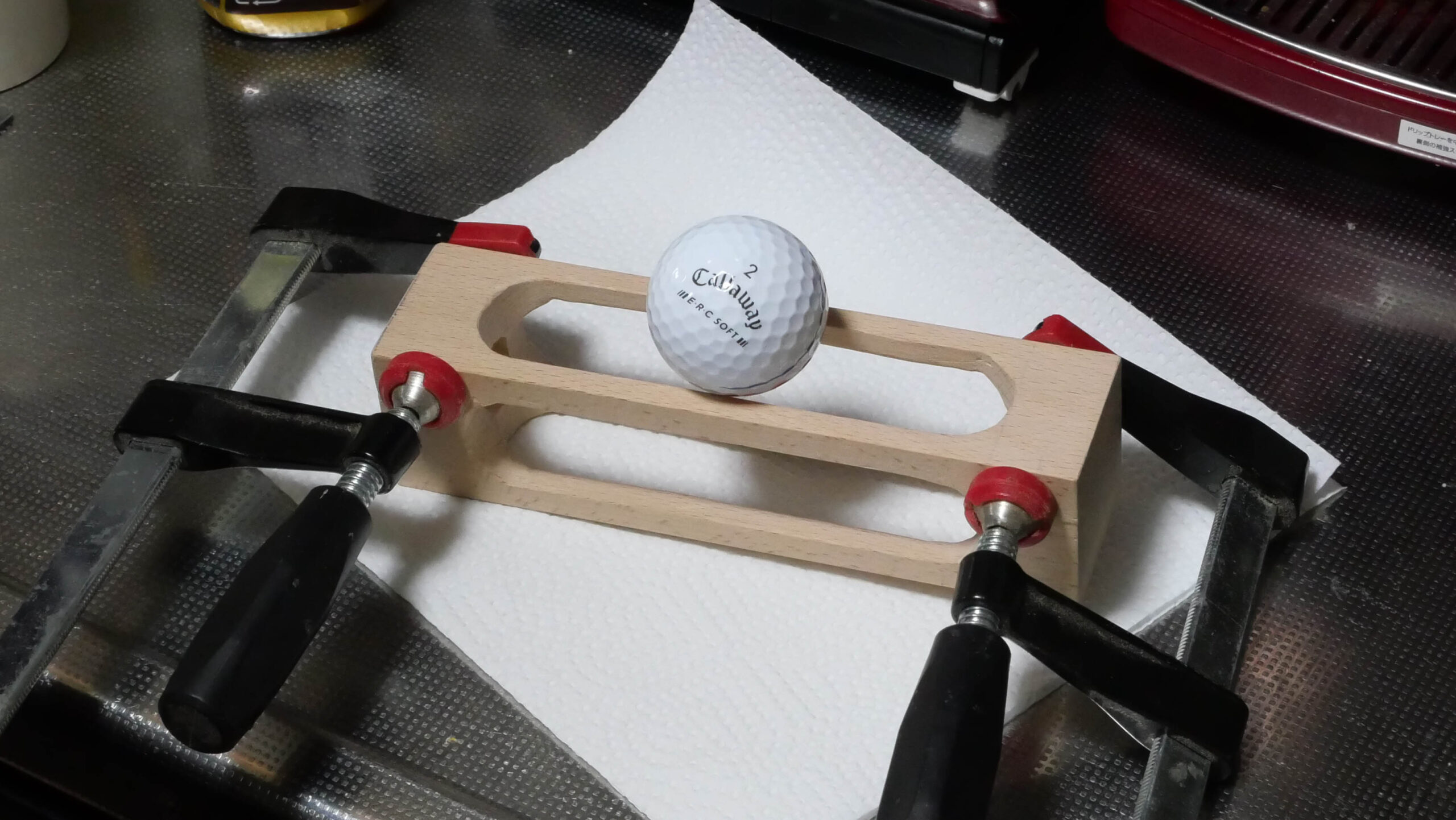 今回はこれをスクロールソー(糸鋸盤)で作り、中にティーを立てるようにしてトロフィー風に仕上げました。
