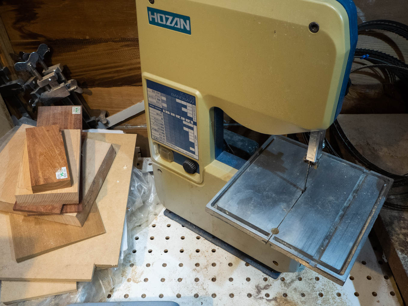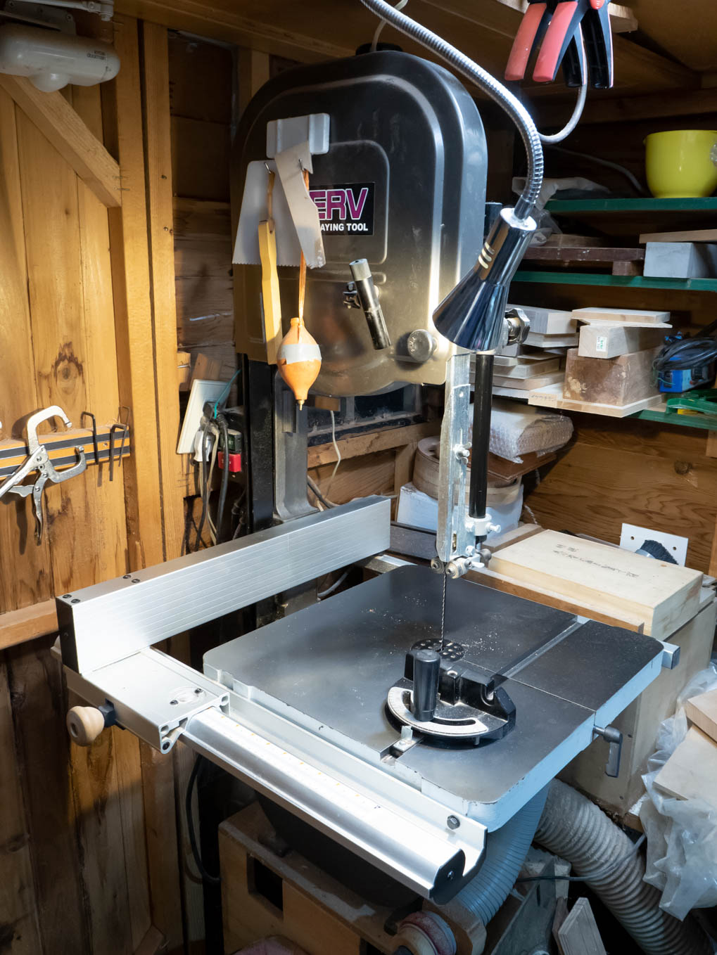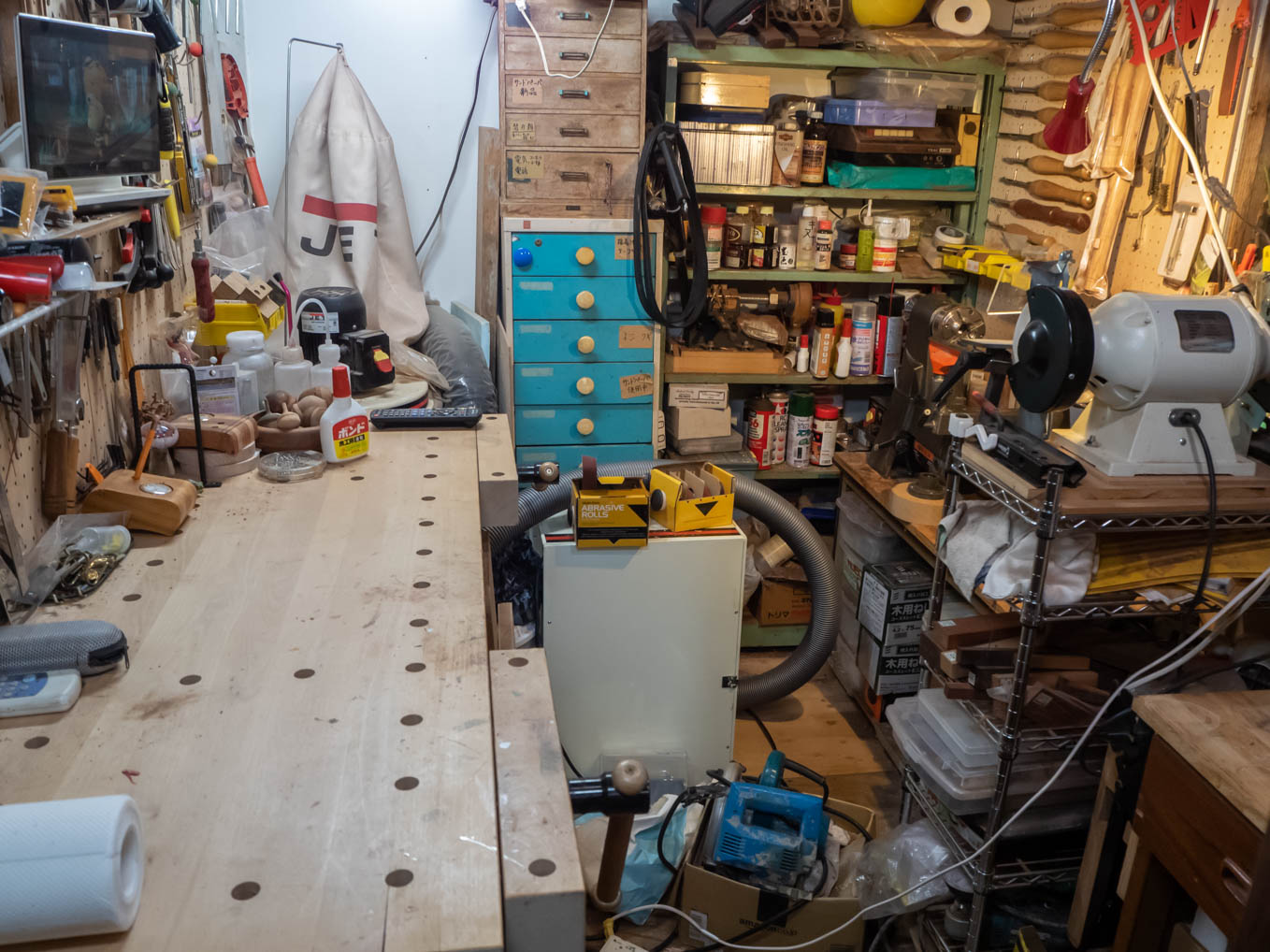 狭いのが難点ですが頑張って大きな機械も入れています。大物は14インチのバンドソー、そして木工旋盤と集塵機といったところです。一番の働き者はバンドソーです。電動丸鋸を据え付けた昇降盤を使っていた時期もありますが、騒音も含めて歳と共にだんだん恐ろしくなってきてバンドソーに替えました。バンドソーも木工旋盤も安全で音も静かなので真夜中の作業も問題ありません。